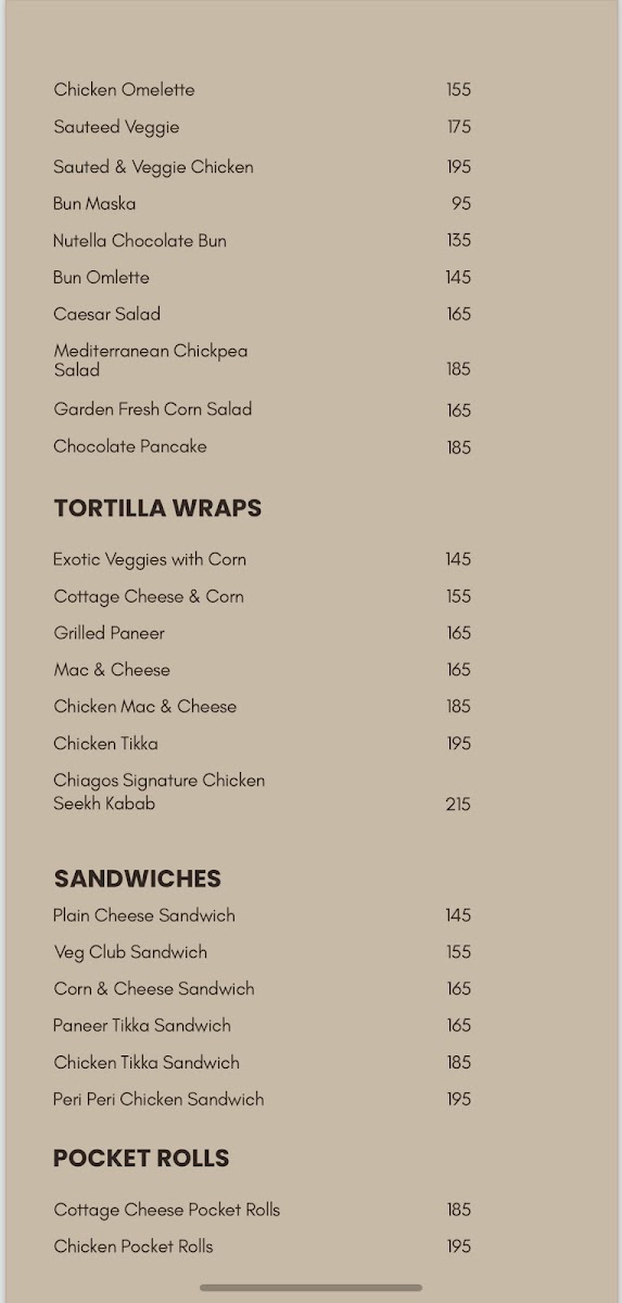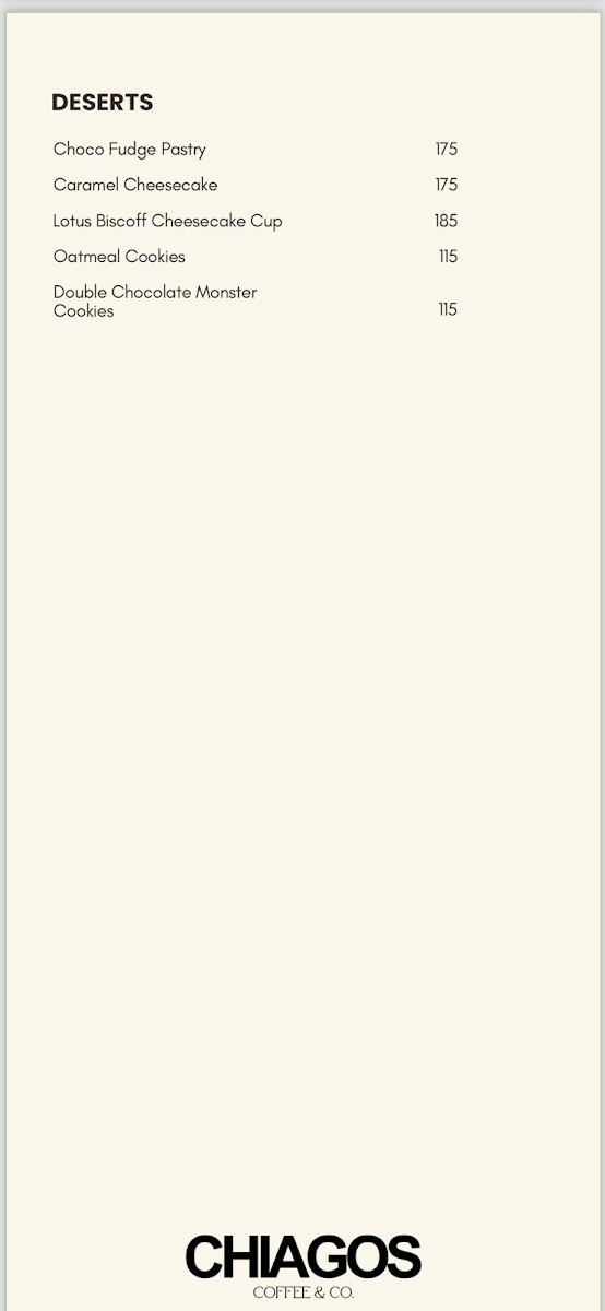 The menu at Chiagos Coffee & Co. offers a variety of options suitable for breakfast, coffee breaks, and light meals. It is organized into several categories that cater to different tastes and preferences.