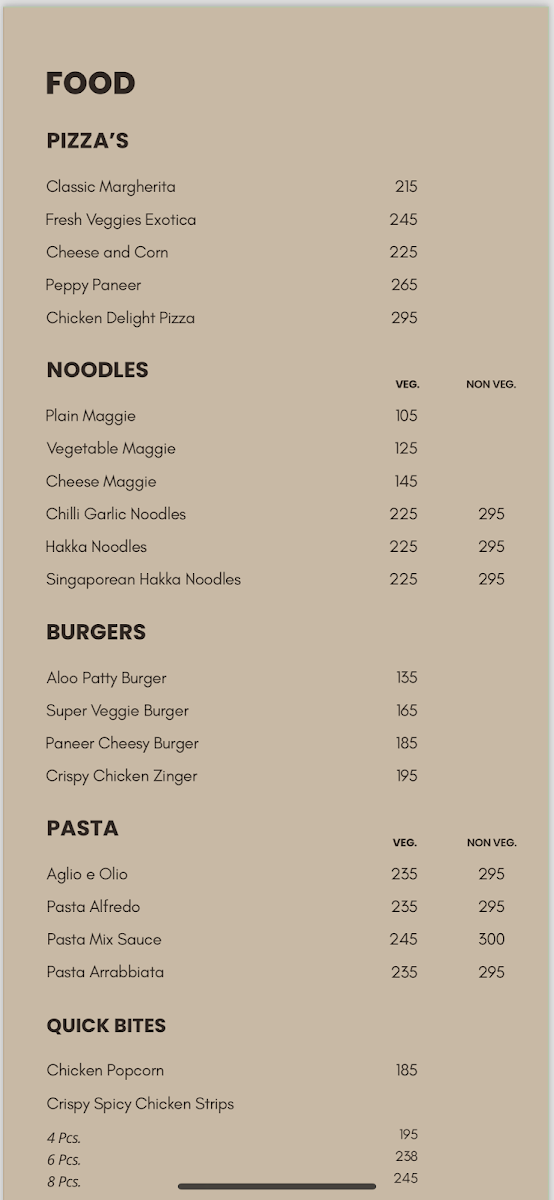 In addition to these, the menu highlights include Shakes and Pasta dishes like White Sauce Pasta and Pasta Bolognese, as well as a Mix Veg Wrap. These options suggest a balance between beverages and more substantial food items.