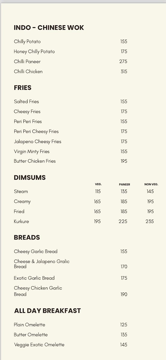 Fries are available in multiple flavors such as Salted Fries, Cheesy Fries, Peri Peri Fries, Jalapeno Cheesy Fries, Virgin Minty Fries, and Butter Chicken Fries, offering a range of choices for side dishes or snacks.